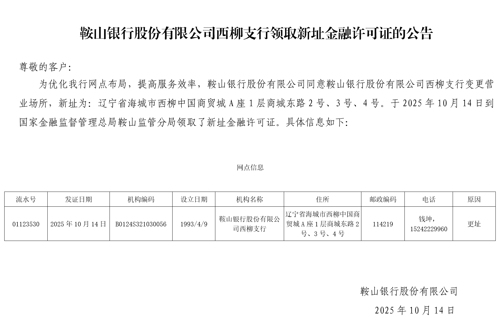 鞍山银行股份有限公司西柳支行变更营业场所的公告